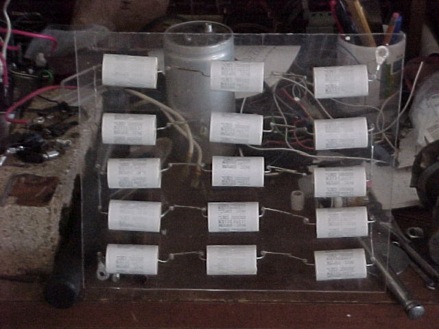 I have made 4 panels, each panel containing 15 capacitors in series. The value of each panel is ~.01uF @ 30kVDC.