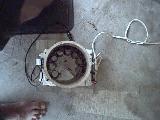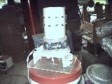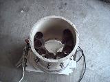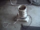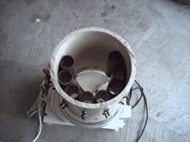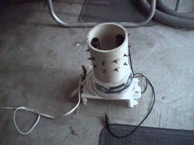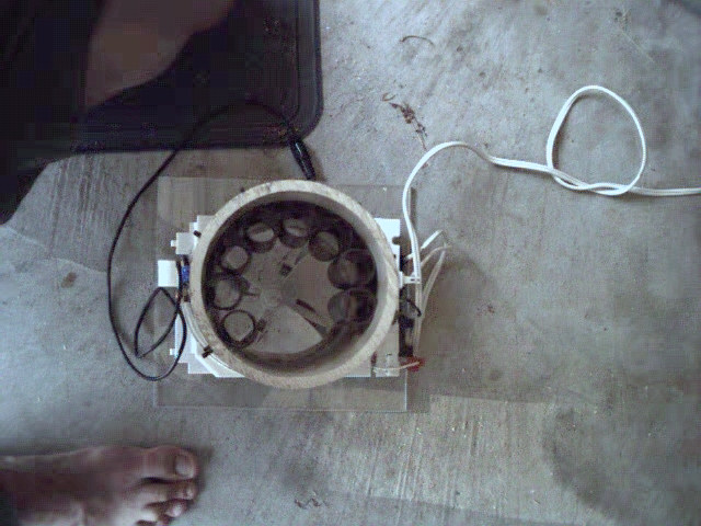 These are some shots looking down on my spark gap. This gap was made using 8 pieces of .75" copper pipe 2" long. These pieces of pipe were the bolted inside of a short length of 4" PVC pipe with brass screws. To set the spacing between each piece of pipe I used a hacksaw blade, which had a thickness of about .030". I have 7 segments available and it is quenched by the fan from a microwave oven.