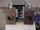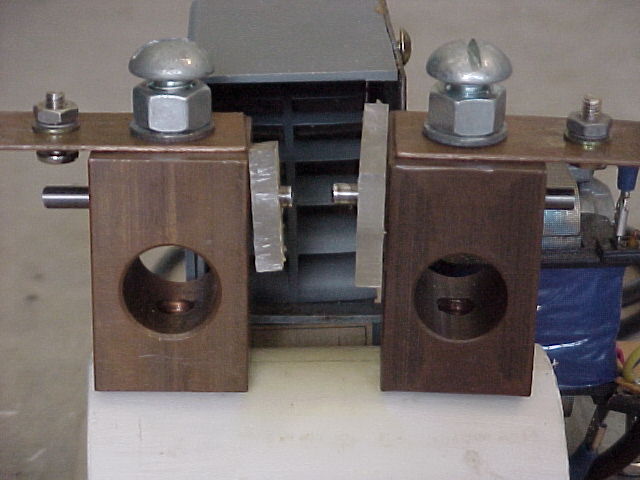 These are some shots of my single gap spark gap. I have 2 Tellurium copper blocks each holding a 3/16" 2% Lanthanated Tungsten electrode. Spacing is presently .3125". The quenching is provided by a squirrel cage fan from a microwave oven.